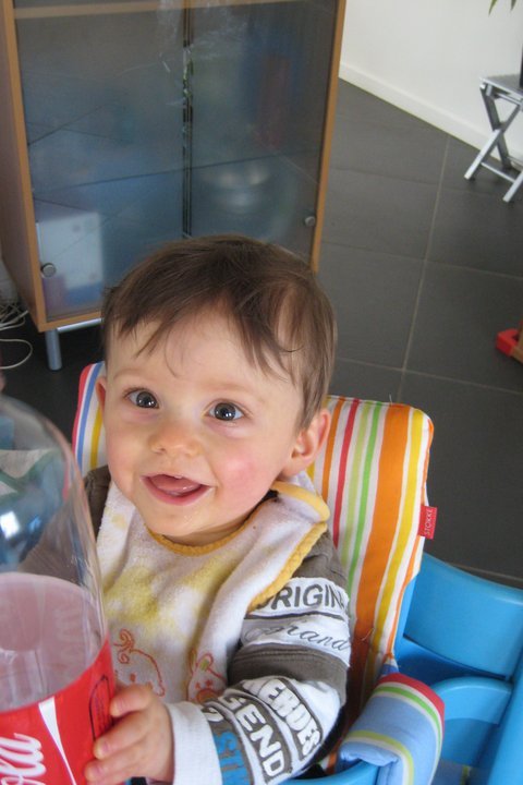 Bon évidemment vous vous doutez bien que j’en ai pas bu du coca (comme maman !) mais c’est sympa de jouer avec la bouteille, je fais plein de bruit en tapant dessus !! D’ailleurs en ce moment, je fais du bruit en tapant sur tout ce que je trouve.